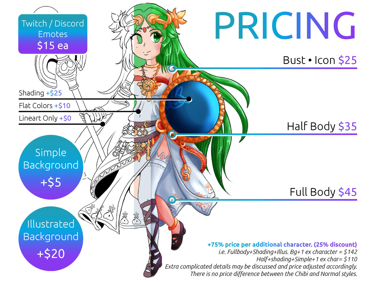 Bust/Half/Fullbody | Lines/Flats/Shaded | Chibi or Normal | How many characters and a description or references of your character(s) including but not limited to color scheme, outfits, personalities... Basically anything that can help me capture them! If you've got a pose, mood or composition in mind, let me know, otherwise I will do what comes to me.